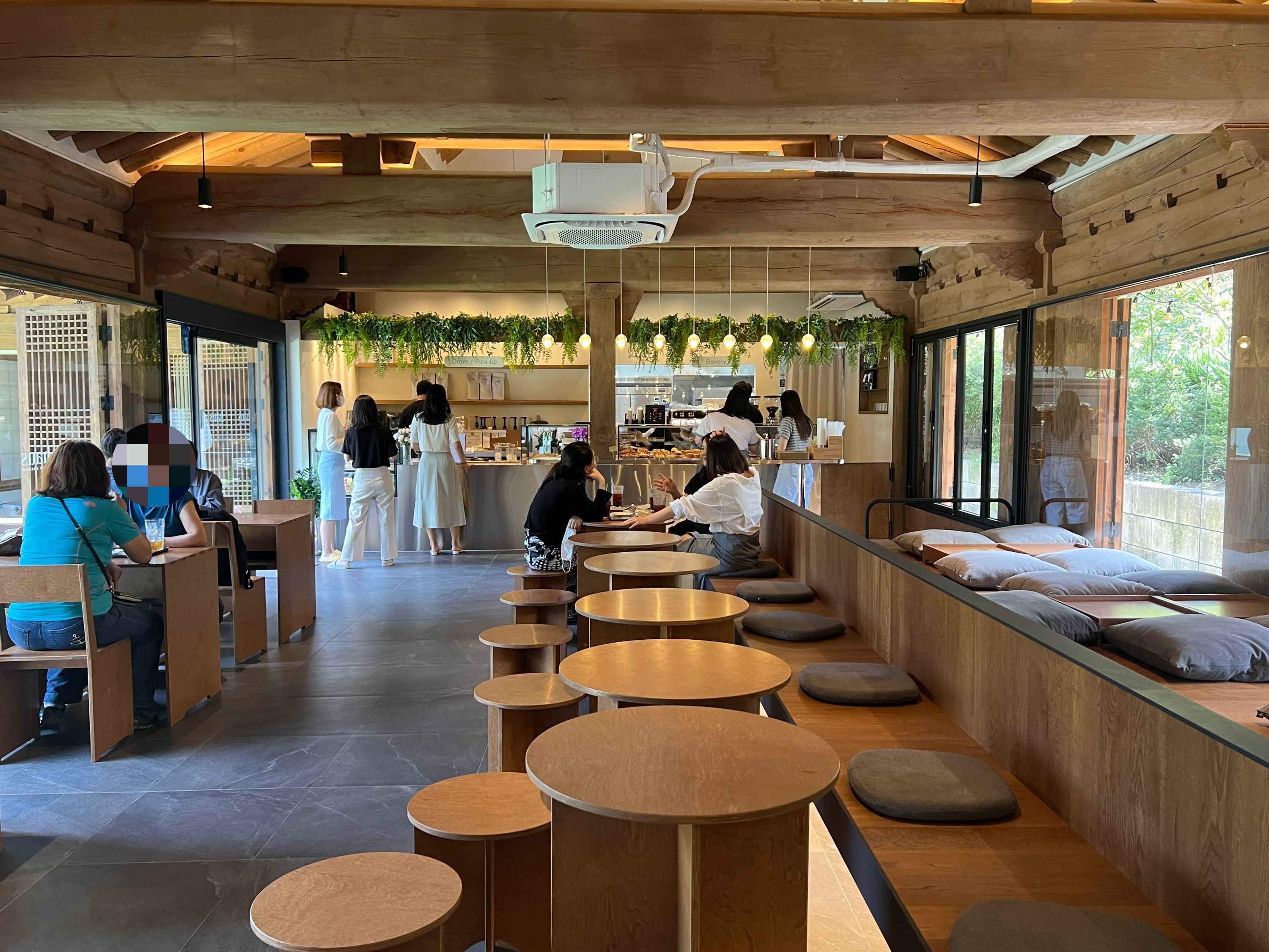 기존 한옥의 공간을 안으로 넓게 터서 개방감이 느껴진다. 큰 통창에서 들어오는 햇볕도 시원하고 한옥의 느낌을 살리는 우드 인테리어로 마루나 테이블 등을 마감했다. 기존 오래된 한옥의 문이나 서까래를 살려둔 게 좋다.
