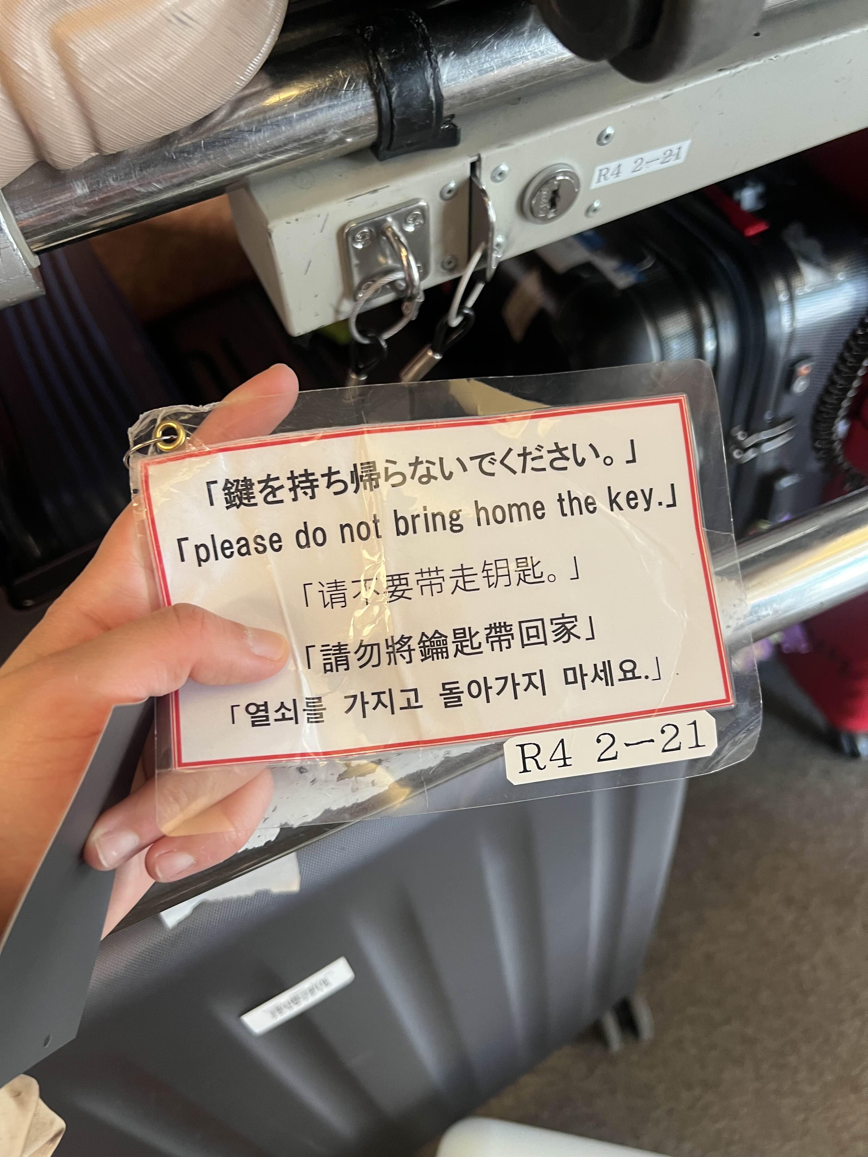 캐리어에 귀중품을 가지고다니다보면 은근히 열차 내 캐리어 보관장소에 캐리어를 놓기가 신경이 쓰이는데, 라피트는 각자 열쇠를 줘서 안심되고 좋았다. 유사한 오사카 교토 공항철도, 하루카의 경우 캐리어에 열쇠는 따로 사용할 수 없었다.