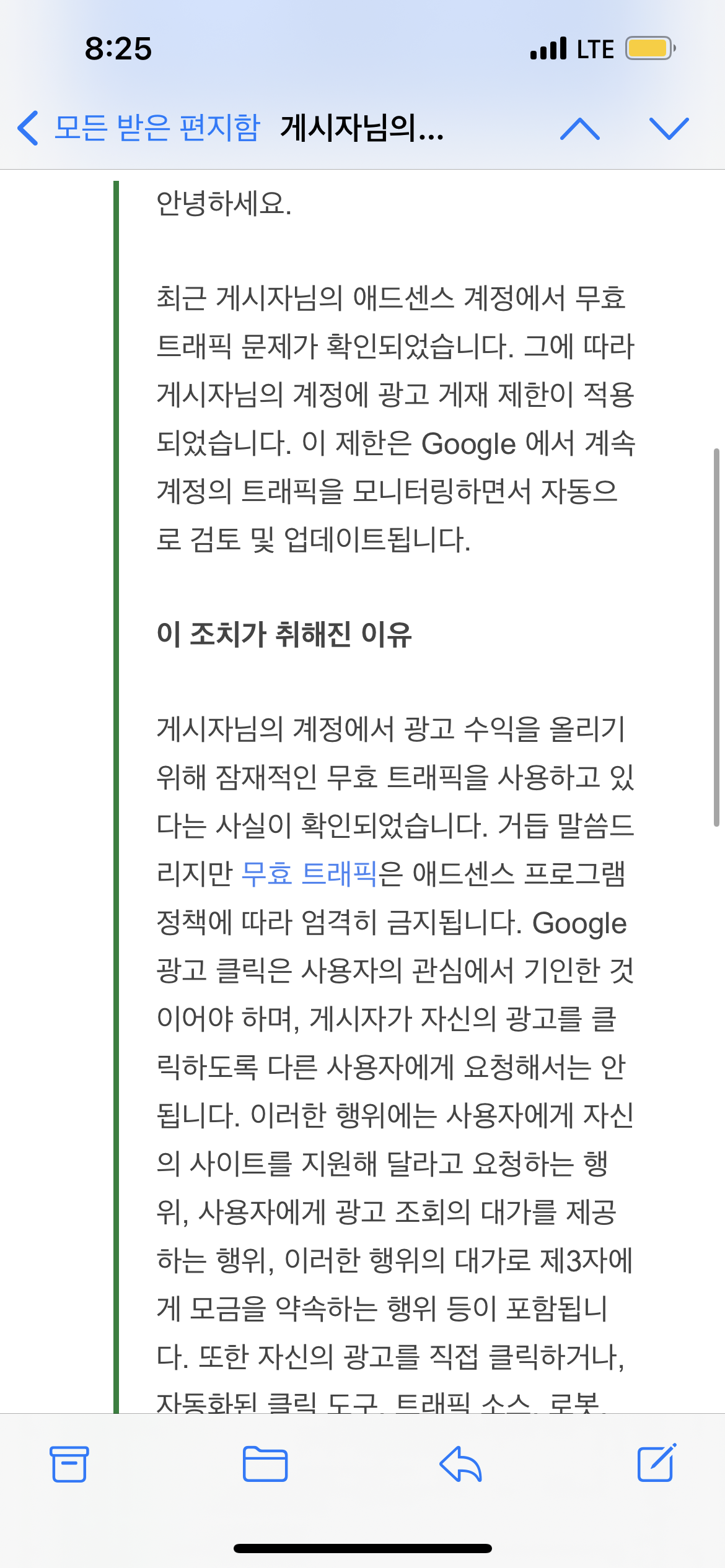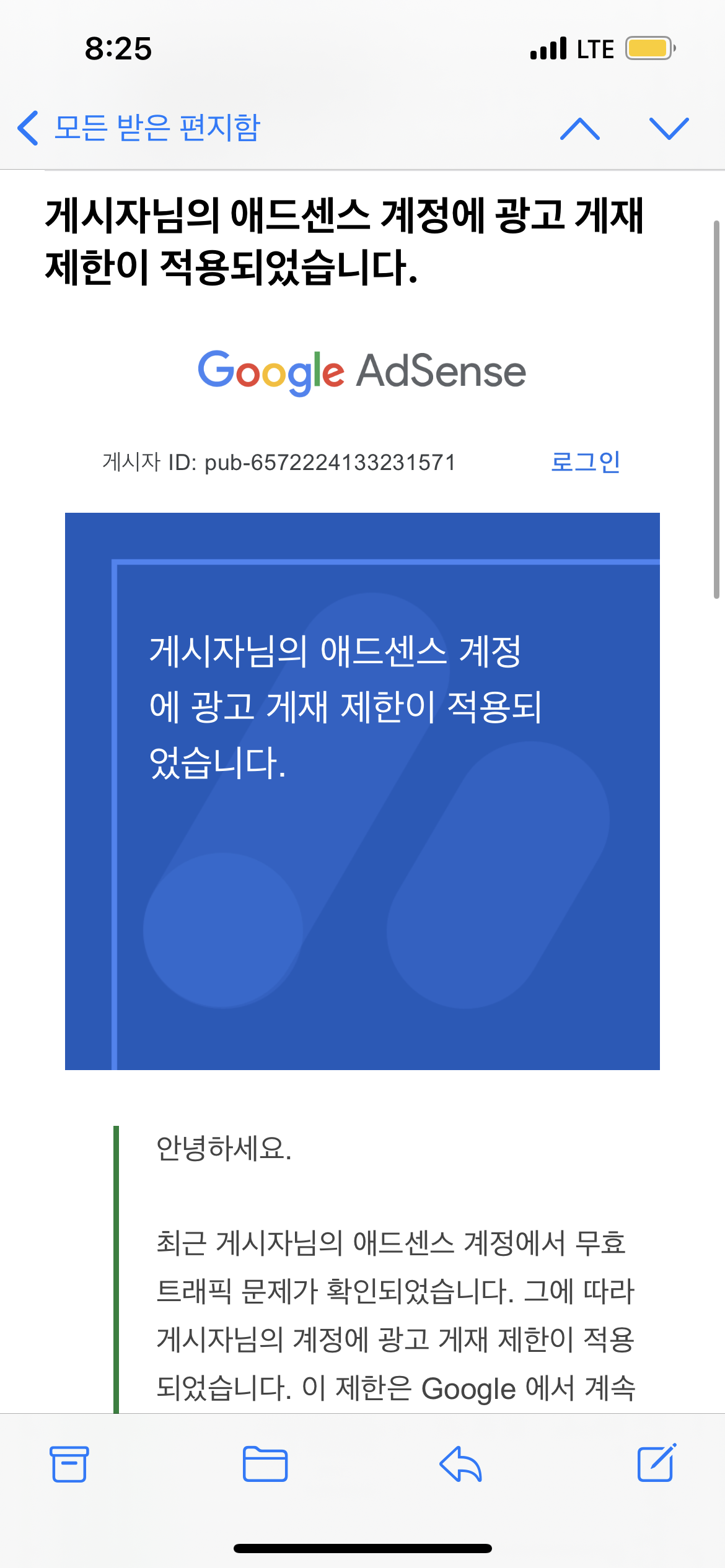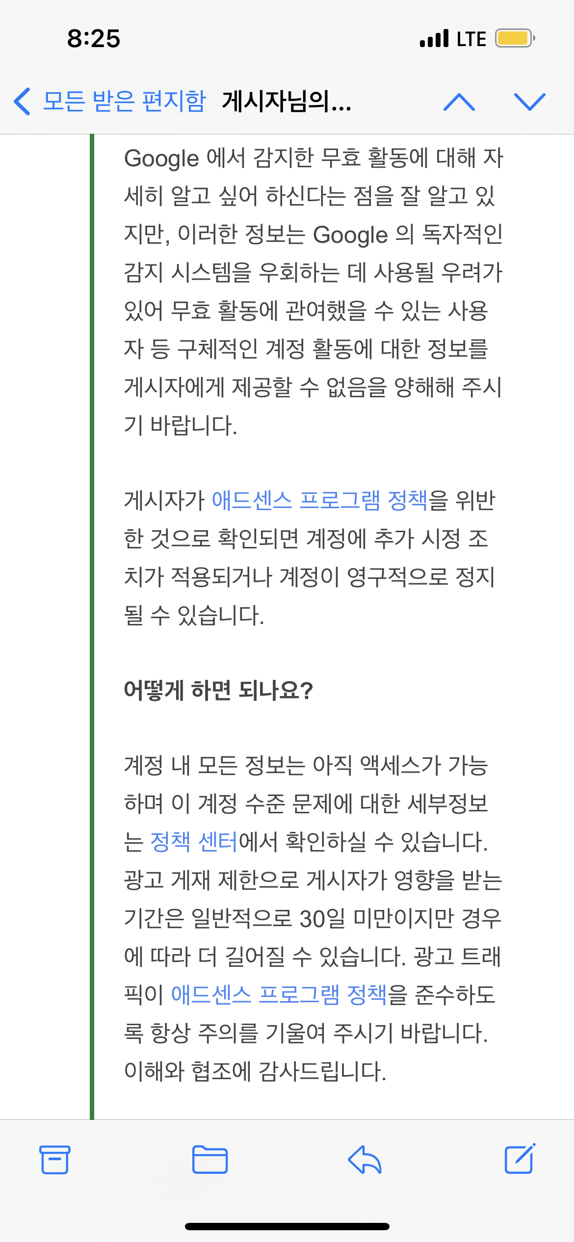 이러한 광고 현상은 구글이 생각하는 건강한 광고 생태계가 아니기때문에 제재를 가하게되고, 제재 당할 경우 이렇게 메일을 받아볼 수 있다 ^ㅡ^...