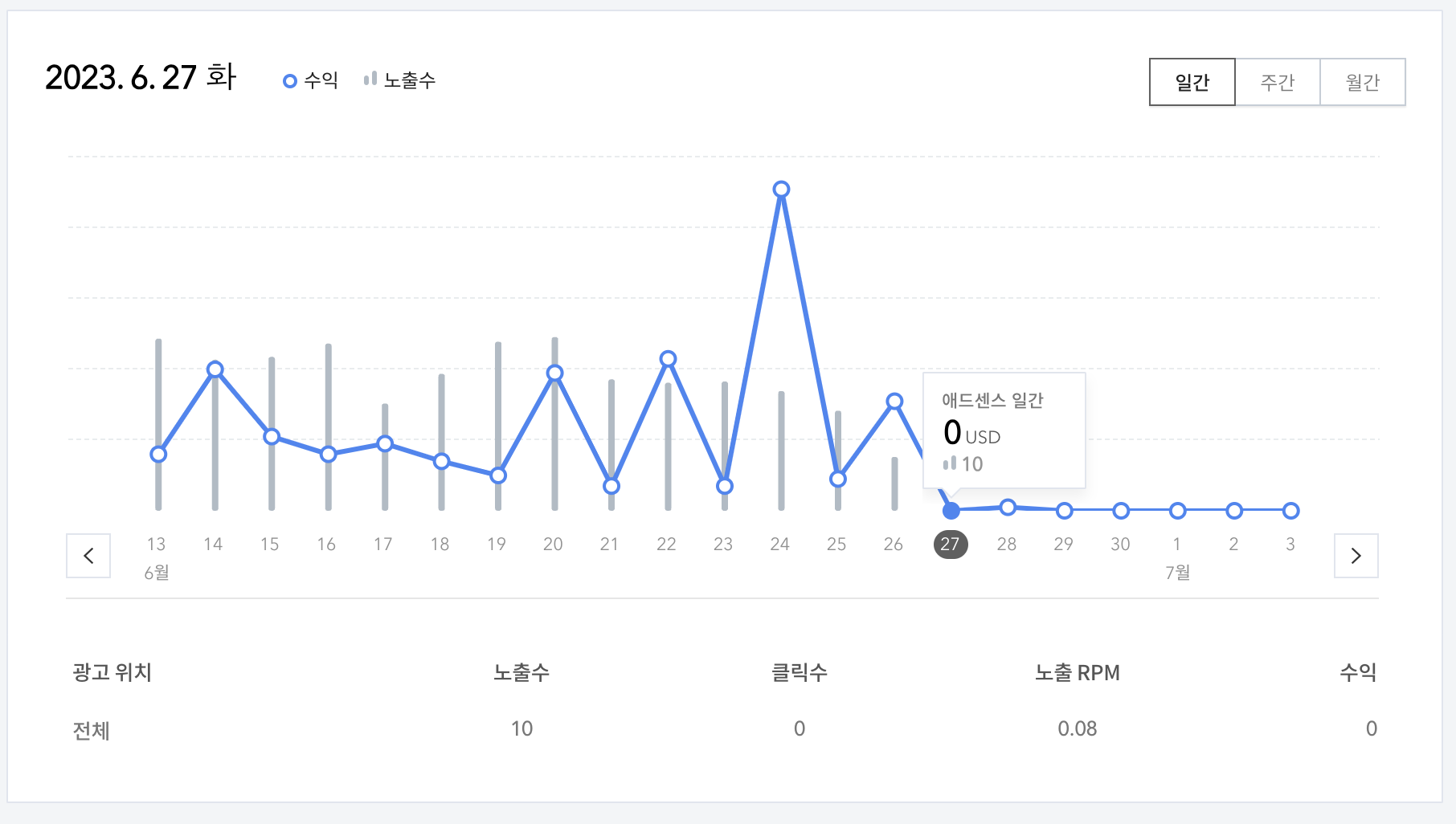10일차부터 광고가 걸리고 미미하게나마 수익 발생. 그런데 무효트래픽 제재를 받기 전 후 기간동안 수익이 전체적으로 갑자기 줄어든듯한 기분을 느낀다..